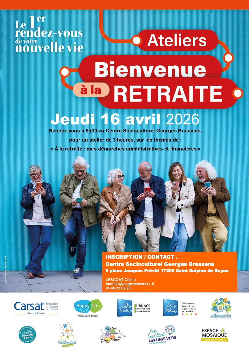 Bientôt à la retraite… ou tout juste retraité(e) ? Et maintenant, on fait quoi ? Le Centre Socioculturel Georges Brassens vous propose un atelier pour vous aider à y voir plus clair dans vos démarches administratives et financières et aborder sereinement cette nouvelle étape de vie. Atelier : Bienvenue à la retraite Jeudi 16 avril…